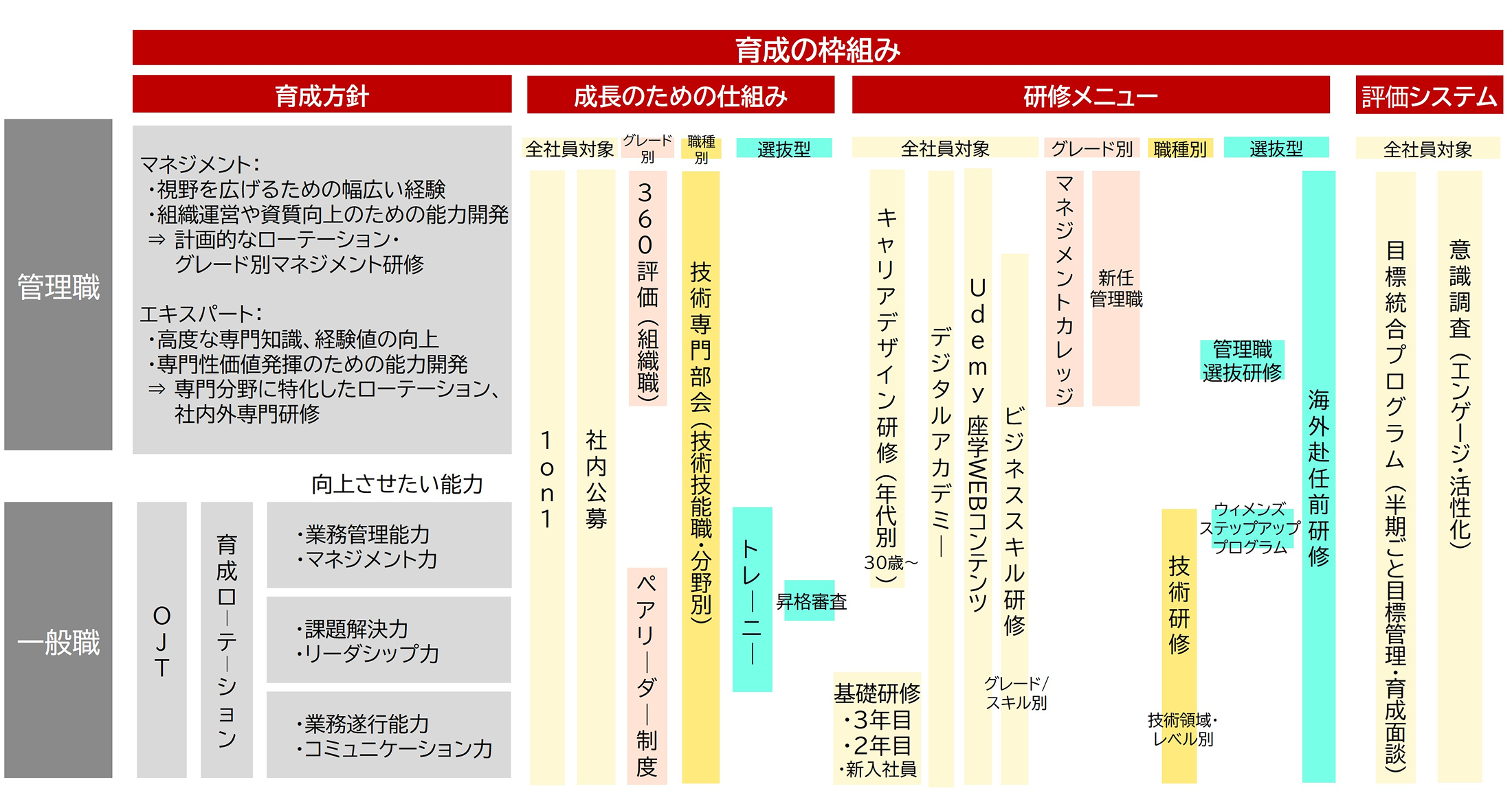 - 社員の自律的な学びの促進や、経営戦略に沿った人材を育成するために、人材育成体系を設定。